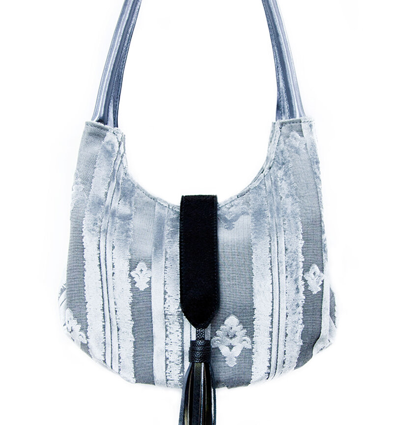 Borsa a spalla di forma leggermente ovale, pratica ed elegante. Morbida nella forma e nei materiali definita da doppi manici, da portare a spalla. La base, realizzata in pelle, è anch'essa di forma ovale.