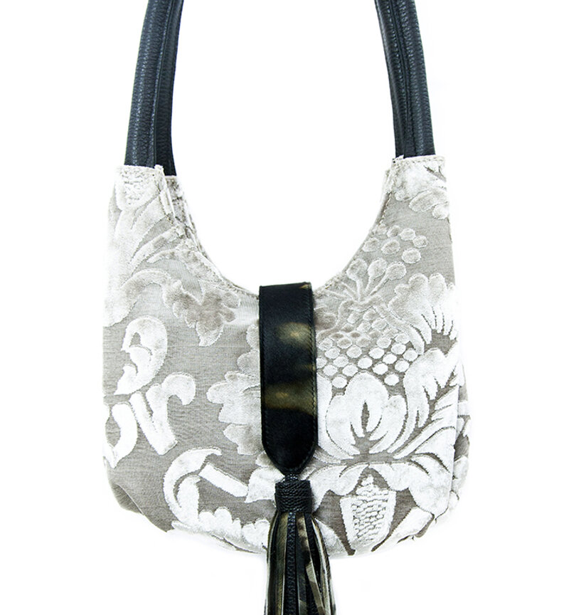 Borsa a spalla di forma leggermente ovale, pratica ed elegante. Morbida nella forma e nei materiali definita da doppi manici, da portare a spalla. La base, realizzata in pelle, è anch'essa di forma ovale.