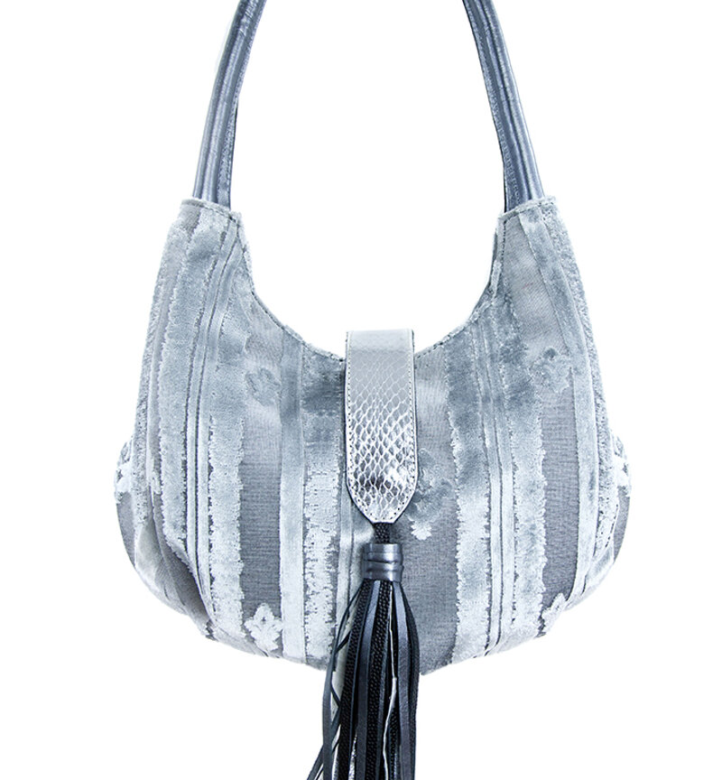 Borsa a spalla di forma leggermente ovale, pratica ed elegante. Morbida nella forma e nei materiali definita da doppi manici, da portare a spalla. La base, realizzata in pelle, è anch'essa di forma ovale.