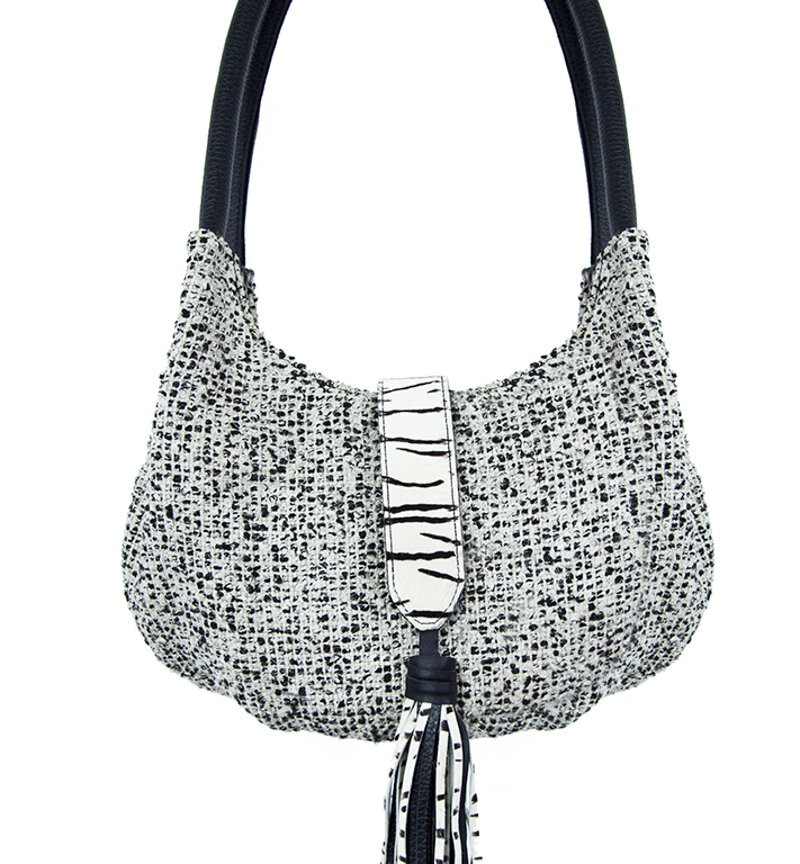 La pattina a fascia che chiude la borsa è in pelle, l'estremità è caratterizzata dalla maxi nappina con stringhe irregolari tagliate e cucite a mano.