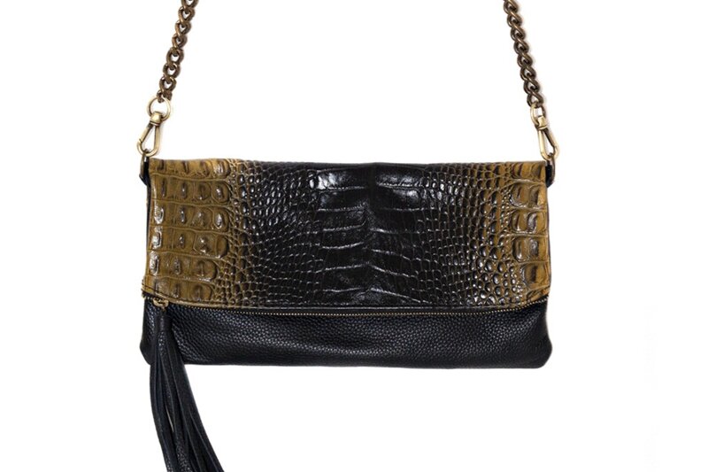 Con la sua forma grafica ed essenziale, risulta essere un esempio perfetto di eleganza e discrezione. Il modello a libro include una tracolla, in catena metallica, dotata di uno spallino in pelle e di due moschettoni che la rendono amovibile. Jane, realizzata completamente in pelle, ha la patta ribaltabile chiusa da una zip in metallo dotata di una meravigliosa e sofisticata maxi nappina in pelle con frange tagliate e cucite a mano. Interno foderato in cinghialino di colore a contrasto. Tutti gli accessori sono in metallo con finitura oro.