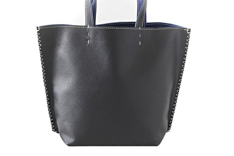 Shopping bag sportiva dalla struttura semi rigida con fianchi a finitura taglio vivo cuciti a mano con punto selleria. Ha dimensioni medie e manici bicolore.